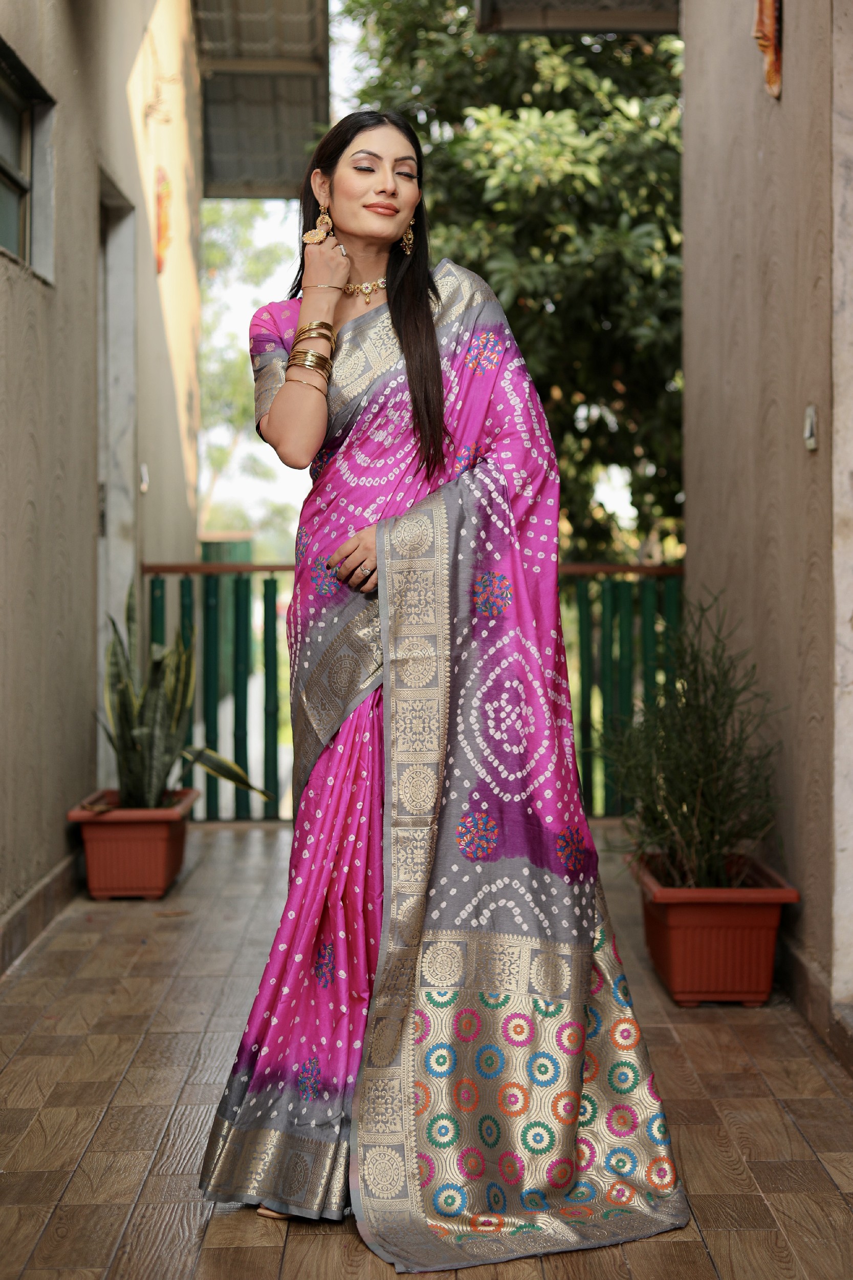 🧣Weaving Rich Pallu & Matching ColouredTessels Saree With Beautiful Bandhej Design And Having A Minakari Rich Pallu🧣